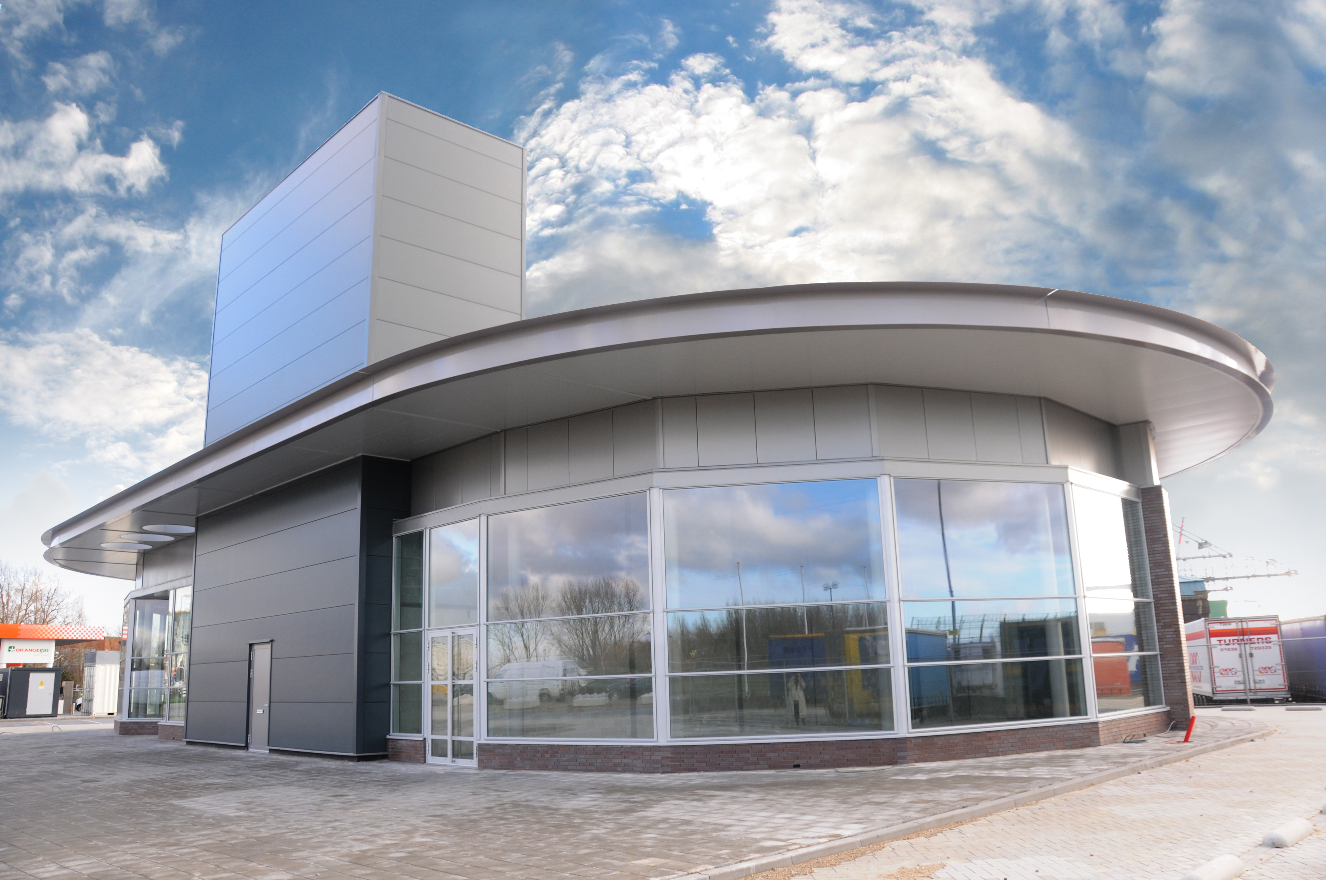 Het horecapaviljoen heeft met zijn ovale vorm een beeldbepalende rol in de industriezone. De locatie is vanaf de snelweg A4 goed te zien en te bereiken. De buitenschil is opgebouwd uit een 3-tal verschillende producten. Een vliesgevel om een open uitstraling te bieden aan de voorzijde. Een strengpers steen, stootvoegloos gemetseld, aan de achtergevel en boven de vliesgevel en luifel zijn sandwichpanelen toegepast. De hoge kolos in de voorgevel is gerealiseerd om het gebouw visueel op te delen en herbergt de installatie op het dakniveau.
